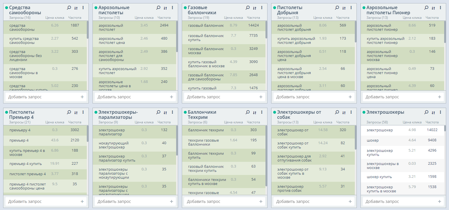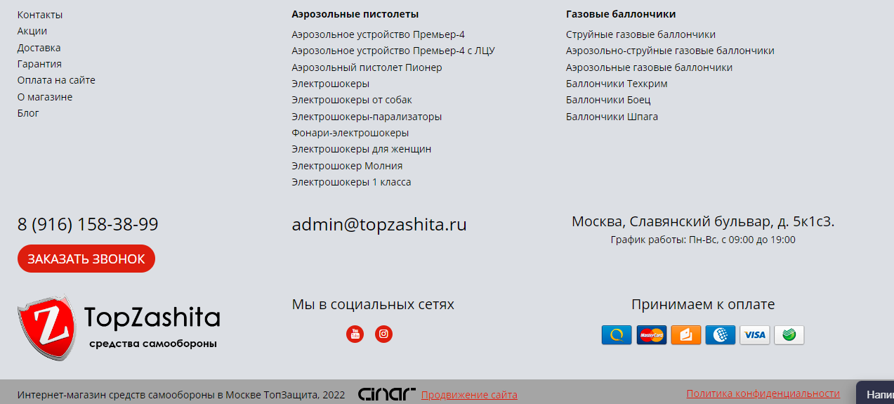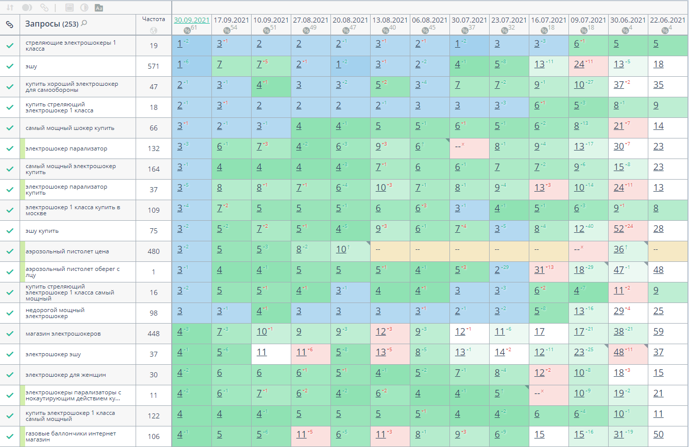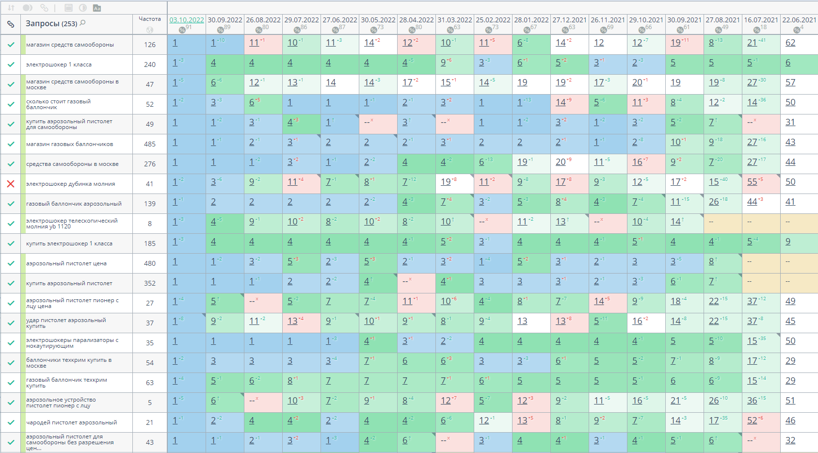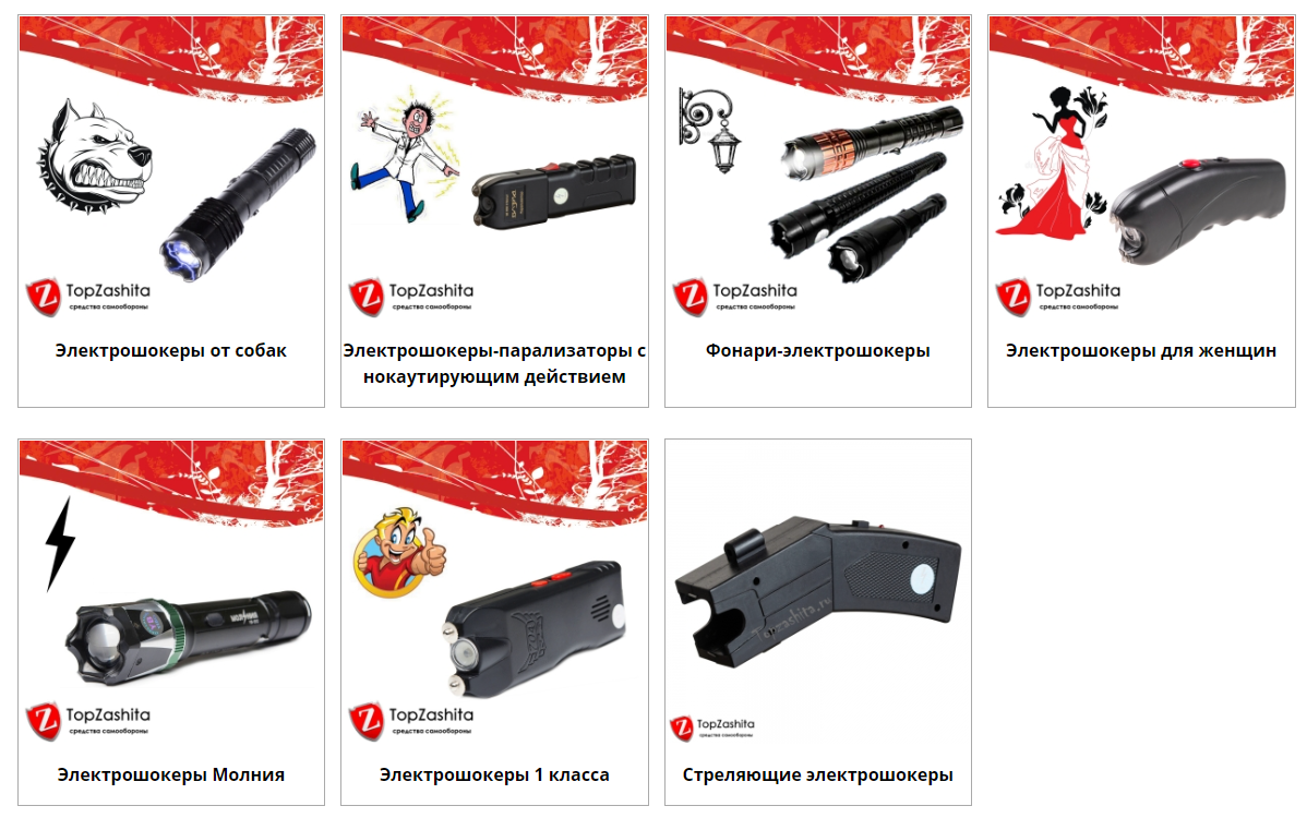 Сбор высокочастотных и среднечастотных запросов по теме средств замозащиты (электрошокеры, аэрозольные устройства, газовые баллончики), оптимизация страниц сайта под запросы для их выведения в ТОП-10 выдачи поисковых систем.