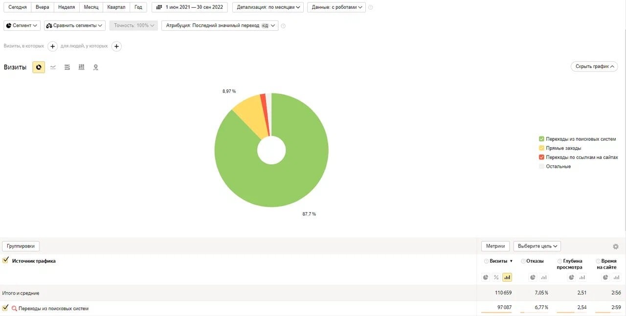 По метрикам: переходы из поисковых систем за 15 месяцев составили 87%, или 97087 переходов. Привлечено более 90 000 потенциальных покупателей в проект, трафик увеличился в 40 раз.