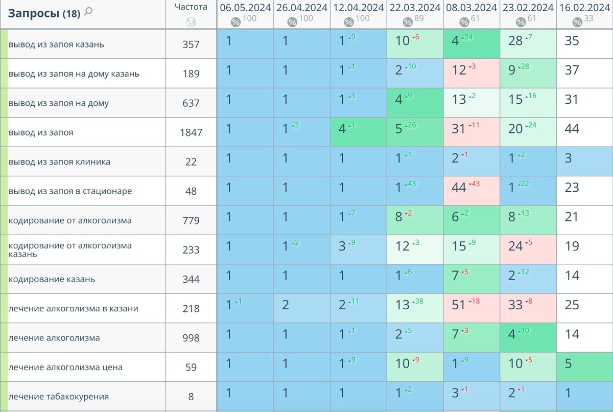 Сбор высокочастотных и среднечастотных запросов по теме услуг наркологической клиники и последующая их отбор по профильным услугам клиента.